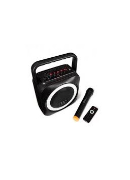 Altavoz portátil karaoke con micrófono inalámbrico. Función karaoke con efecto de eco, ecualizaciones, función Voice Canceller y control de volumen independiente de la música y los micrófonos. Reproduce música desde smartphones, tablets y otros dispositivos Bluetooth. Reproductor USB/SD/FM y grabador del audio del micrófono. Micrófono inalámbrico VHF (175'5 MHz). Función eco y ecualizaciones, seleccionables. Anillo LED con efectos luminosos seleccionables. Mando a distancia. |