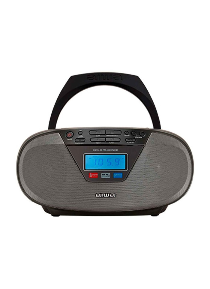 Radio CD portátil aiwa BBTU-400BK en color negro con altavoces incorporados con 6W de potencia y pantalla LCD, sintonizador FM y lector de CD, conexiones bluetooth, USB y jack 3.5, funciona con adaptador de corriente