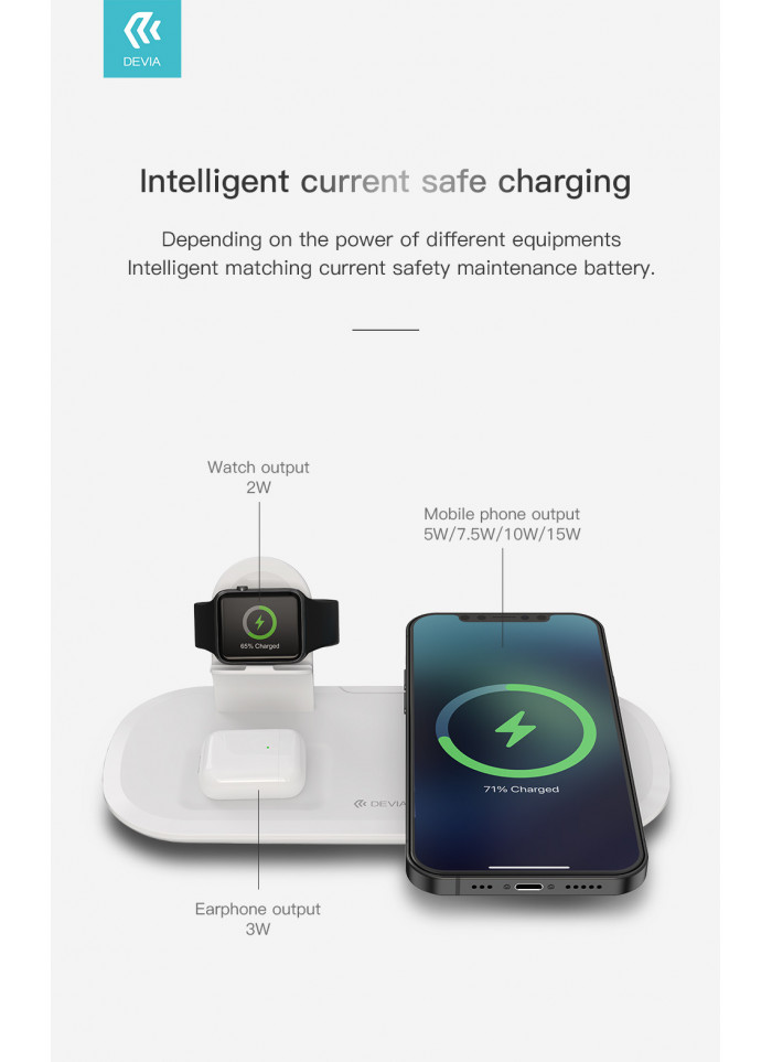 Cargador Inalámbrico 3 en 1 - Le permite cargar tres dispositivos simultáneamente, ahorrando espacio y tiempo. Para usuarios, puede cargar su iPhone, iWatch y AirPods simultáneamente; cargar dos iPhone y iWatch simultáneamente.