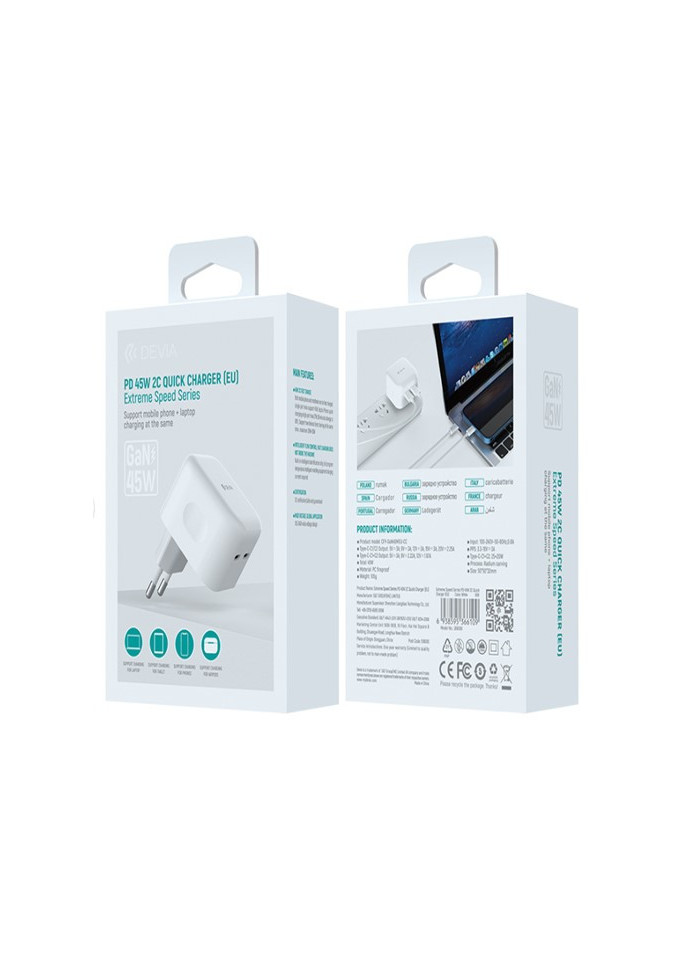 Features: GaN 45W(C+C) Quick Charger EU *Input:100-240V~50-60Hz,0.8A *Tpye-C1/C2 Output:5V3A/9V3A/12V3A/15V/3A, 20V/2.25A *PPS : 3.3-16V/3A *Tpye-C1+Tpye-C2:20W+25W *Output power: 45W (Max) *Materia: PC fireproof *Weight:109g *Size:50*50*31mm *Certificatioin: CE |