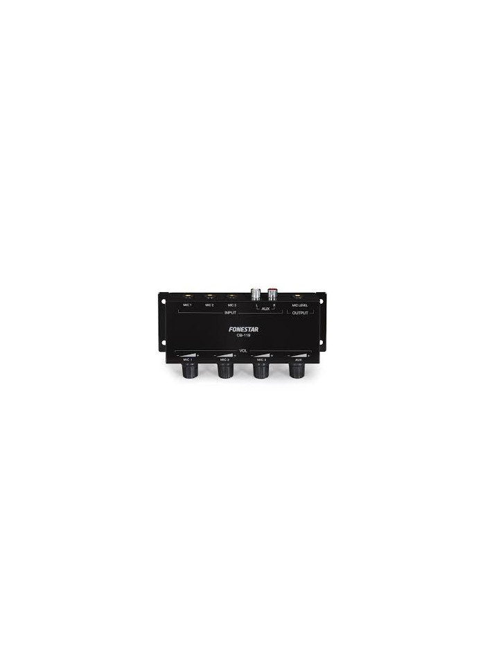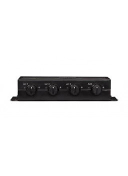 CARACTERÍSTICAS: | Mezclador pasivo de 3 micrófonos y 1 entrada auxiliar. Salida de nivel de micro para conexión a 1 entrada de micrófono. |