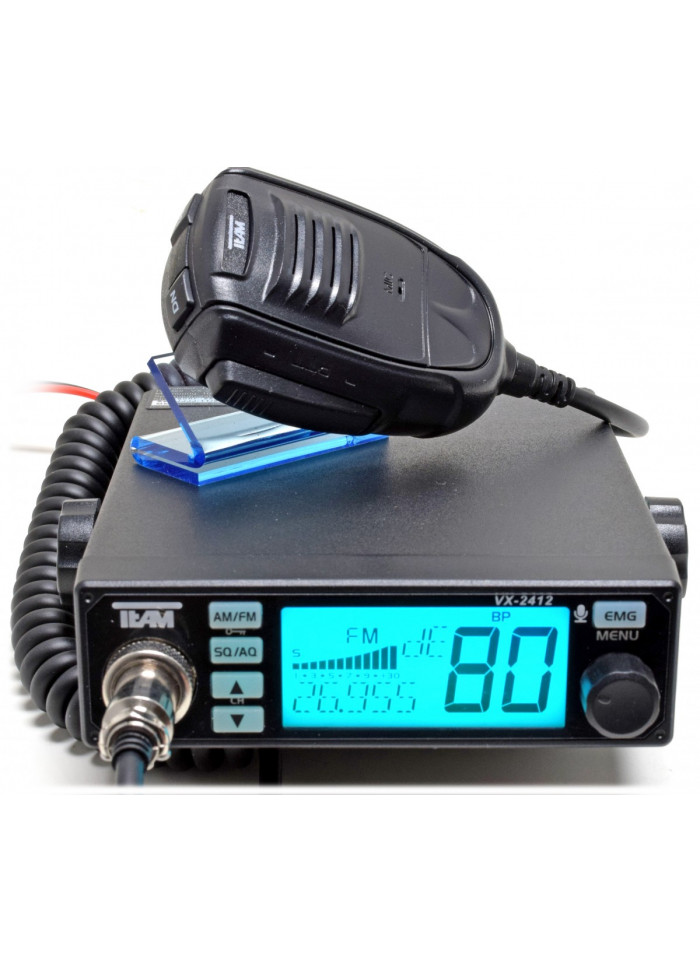 Emisora Team CB-3230K VX-2412E de banda ciudadana CB-27 multi-norma Europea, incluye soporte DIM para montar en hueco de auto-radio, dispone de 40 canales en AM y FM, podemos conectarla indistintamente a 12 y 24 VCC, tiene un gran display LCD en el que podemos ver canal, frecuencia, s-meter,... el gran display dispone de 7 colores diferentes, 6 niveles de brillo, squelch manual y automático, incluye tonos CTCSS y DCS, roger-beep, micrófono con subida y bajada de canales,......