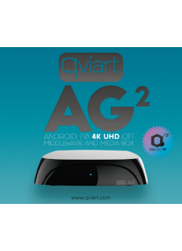 Receptor IPTV Qviart AG2 con sistema operativo Android 7.0, resolución Ultra HD 4K, WiFi DualBand (2.4/5Ghz) + Bluetooth y QTV Online TV con Stalker, Xtream y M3U todo en uno. El hermano mayor del receptor Qviart AG, con el doble de memoria DDR3 (2GB) y el doble de memoria flash (16GB).
